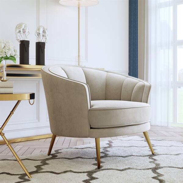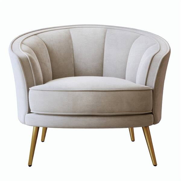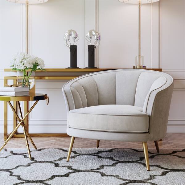 Introducing our modern Thia Accent Chair with a seashell-inspired back and gold-finished legs that add contemporary glam to your living room or den. This chair is designed with a solid and engineered wood frame, supported by four metal legs for a shining contrast.