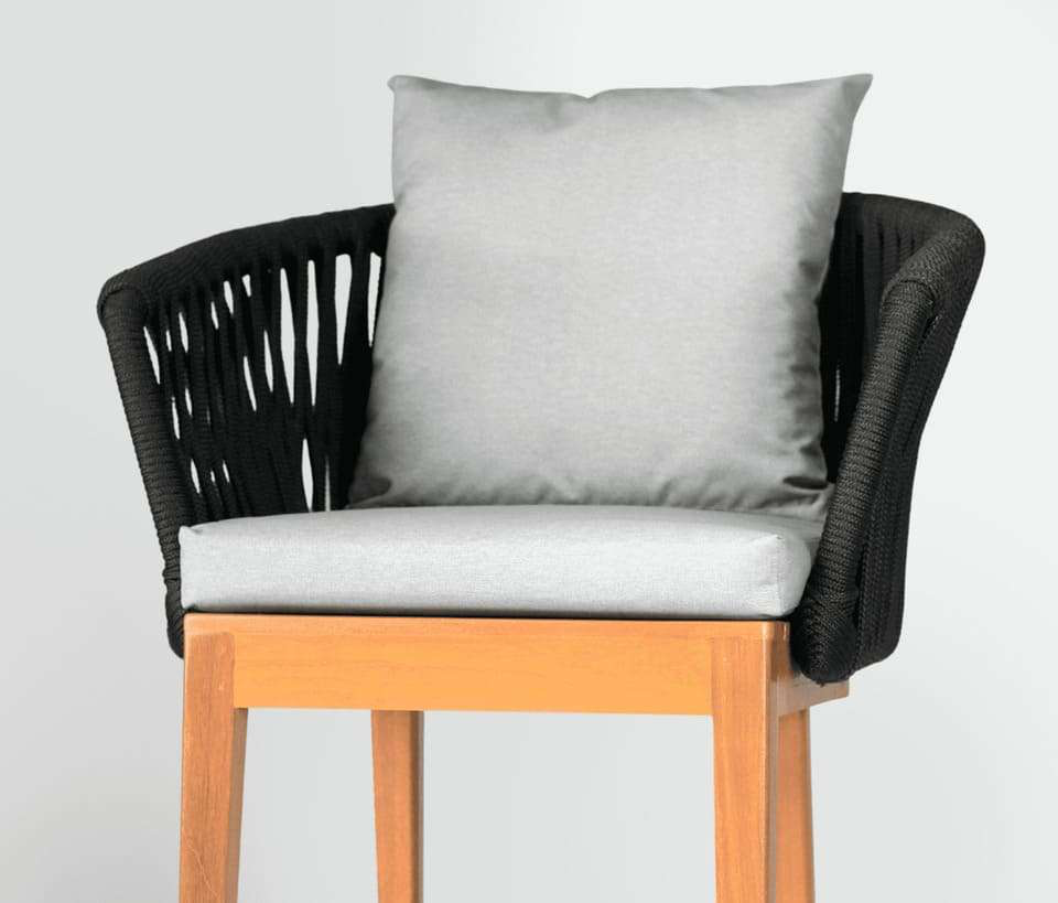 Timber legs with woven back detailing and cushioned seating blend artisanal texture with stable, refined bar-height comfort.