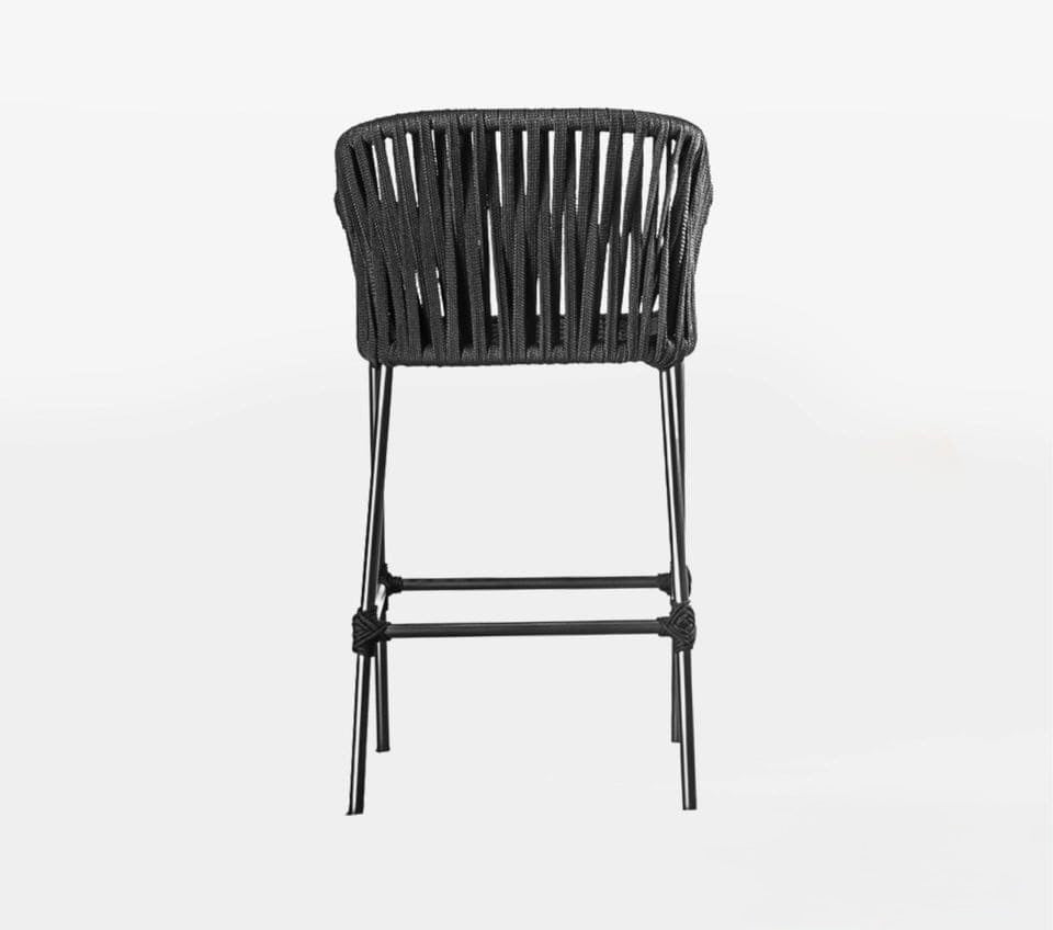 A metal bar-height frame with woven backrest provides dependable comfort and visual lightness for contemporary bar and counter settings.